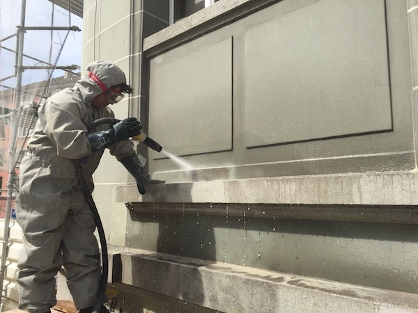- L’hydro-gommage (4 à 7 bars) est réservé pour les façades en bétons avec une finitions sablée, poncée ou lavée et pour les pierres naturelles dures, semi-tendres ou tendres