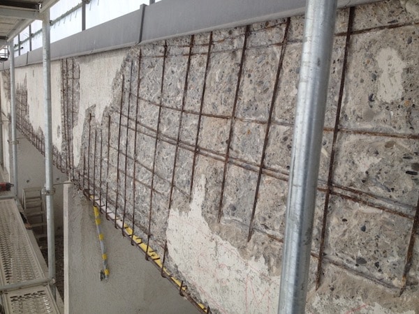 La deuxième étape pour l’entretien des façades en béton est le traitement de la carbonatation. La carbonatation (aussi appelée « cancer du béton ») est un phénomène chimique oxydant les armatures du béton, les faisant gonfler et provoquant l’éclatement de la peau de béton qui la recouvre. Deux types de traitement sont possibles : curatif et préventif. Le traitement curatif est réalisé lorsque les façades sont à un stade avancé de ce cancer et cette intervention se fait en 8 étapes. Le traitement préventif se réalise lorsque le développement du cancer est à un stade peu avancé et nous le réalisons avec un inhibiteur de corrosion consistant à stopper le processus de carbonatation sans avoir besoin du traitement curatif. Il est par ailleurs systématiquement préconisé comme complément de traitement au traitement curatif.